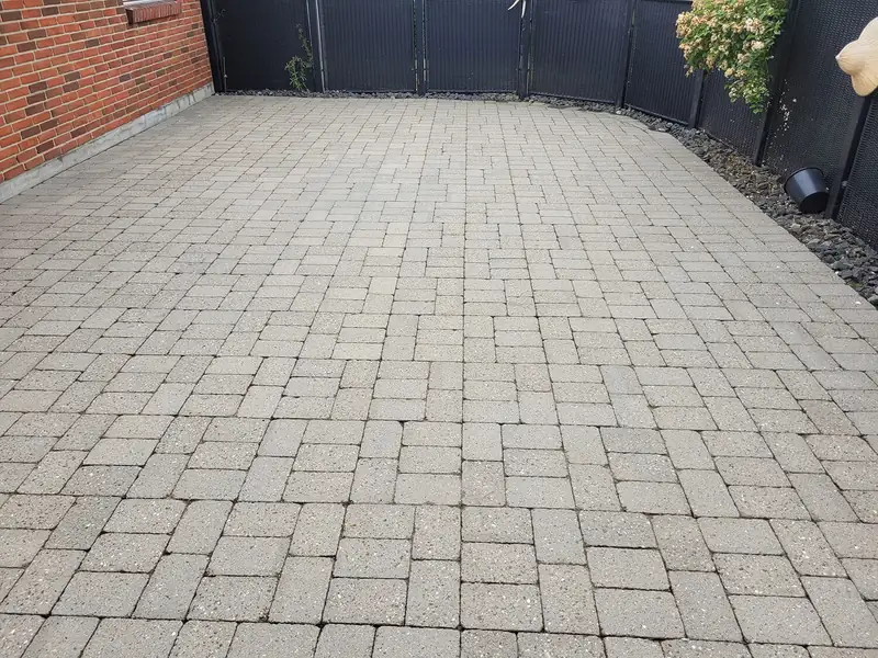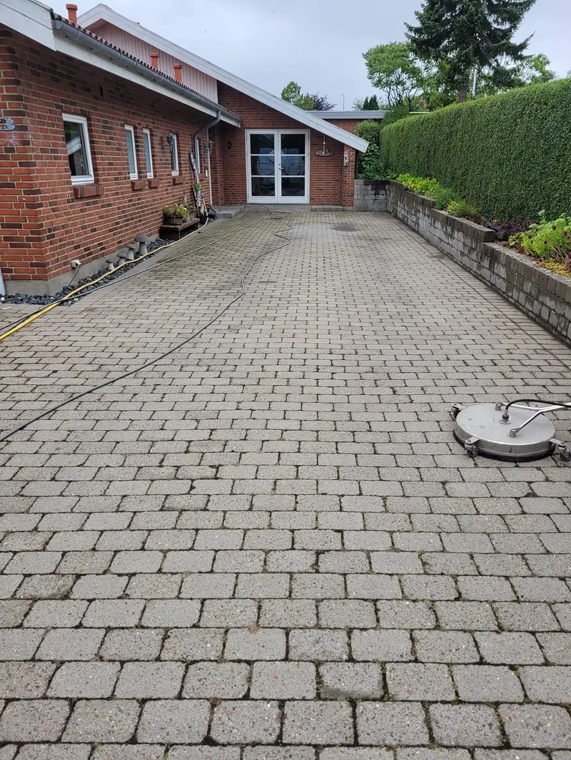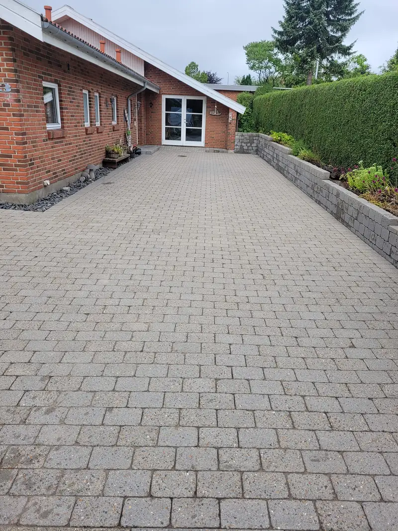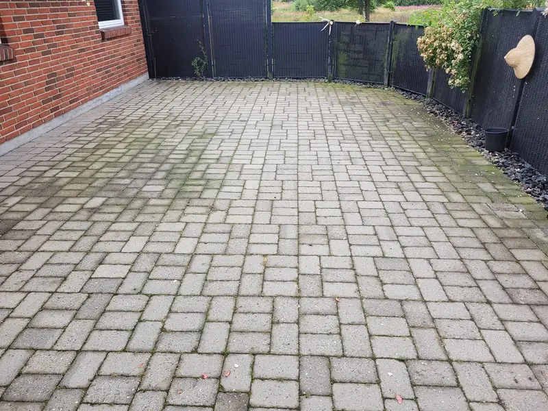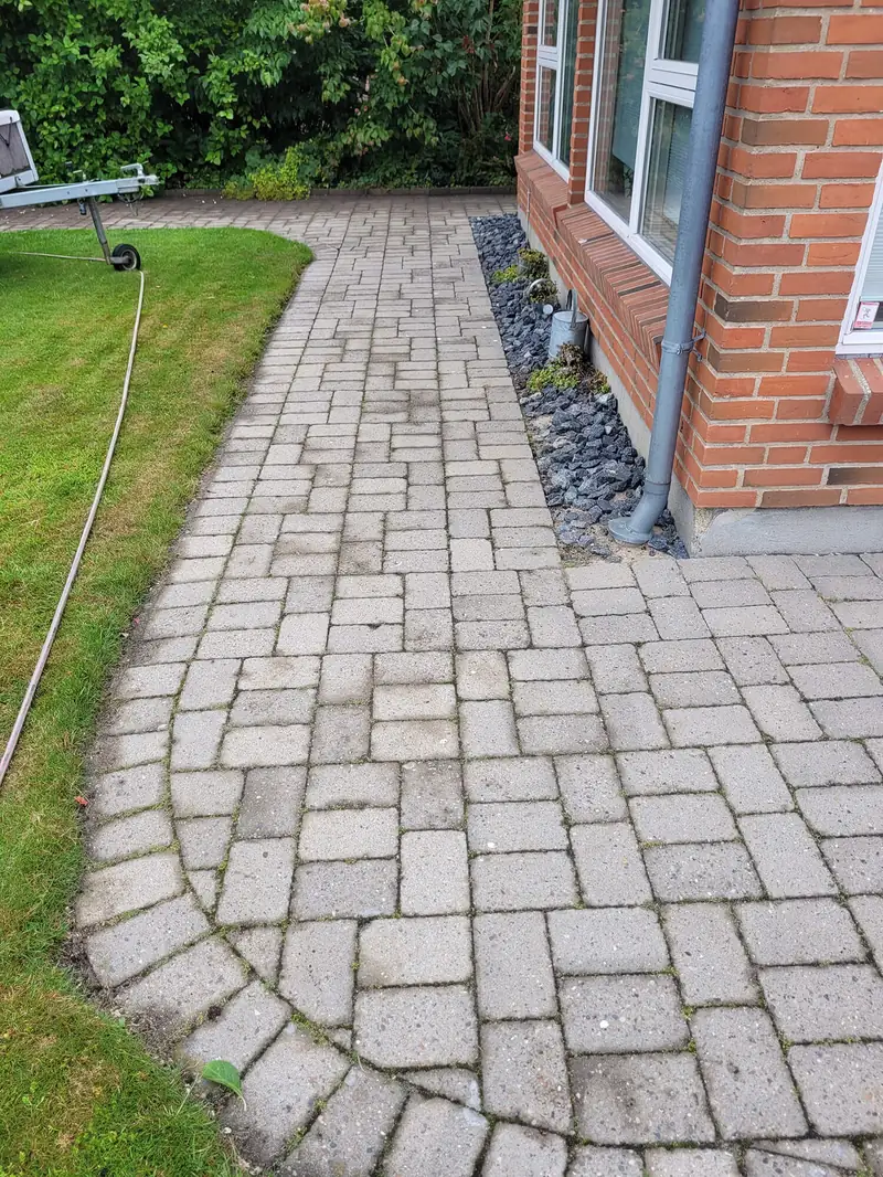 Fliserens og algebehandling i Vejen - for privat kunde i Vejen har vi renset et samlet fliseareal (Holmegaardssten) på 350 m2 bestående af terrasse, indkørsel samt gangbaner rundt om huset. Flisene er både algebehandlet, imprægneret og vi har samtidigt lagt nyt fugesand så fliserne vil ligge stabilt efter den grundigt udførte rensning med et tryk på 300 bar.