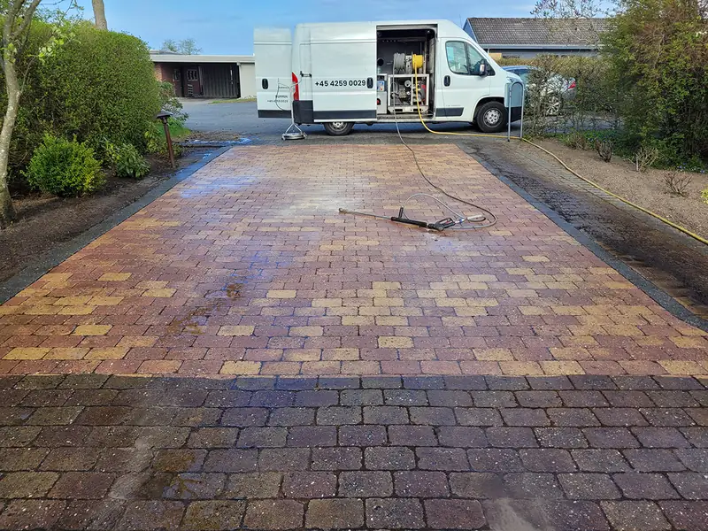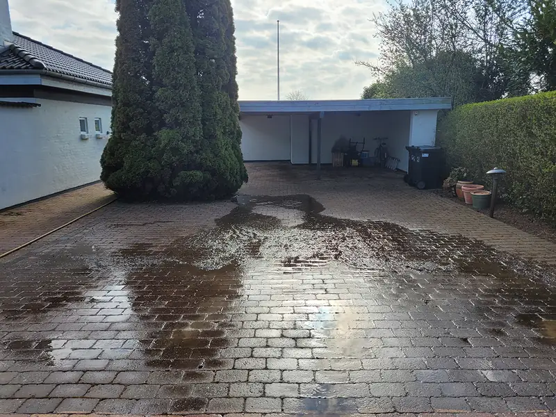 Udover effektiv rensning har vi udført algebehandling for at fjerne mos og alger, imprægnering for beskyttelse mod fugt og snavs, samt lagt nyt fugesand, så fliserne står stabilt og ser helt nye ud.