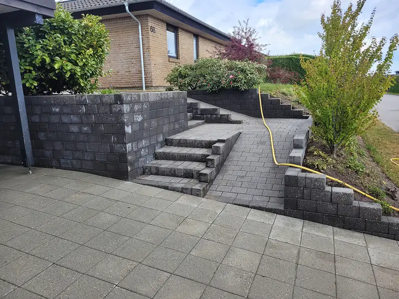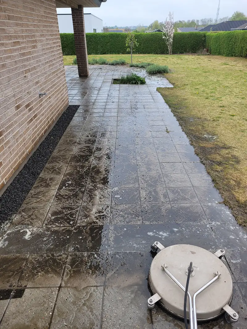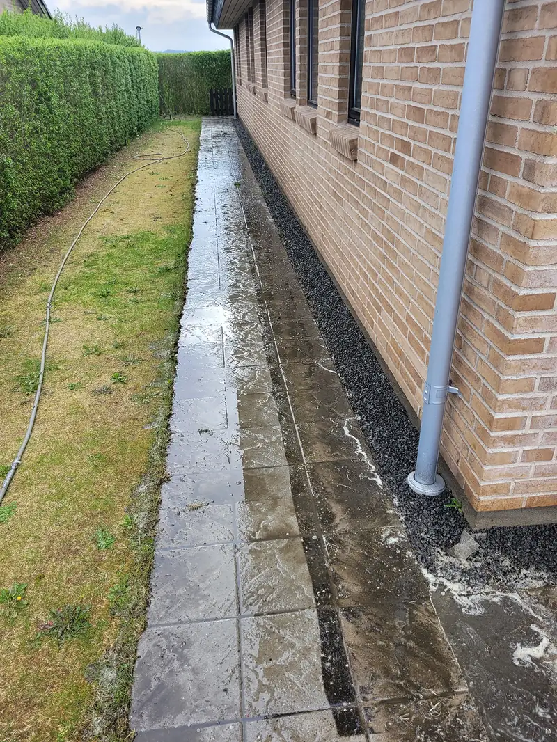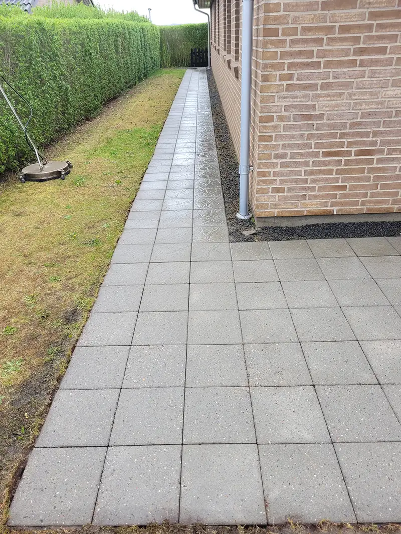 Særligt gangbaner var hårdt medtaget af flisepest, men efter en dybdegående rens med højtryksrenser ved et tryk på 300 bar og hedvand står fliserne næsten som nye igen.