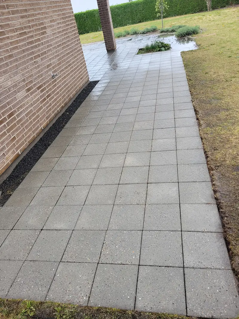 Hos privat kunde i Støvring syd for Aalborg har vi renset 330 m2 granitfliser, samt udført algebehandling og overfladebehandlet med imprægnering af både terrasse, indkørsel og gangbaner.