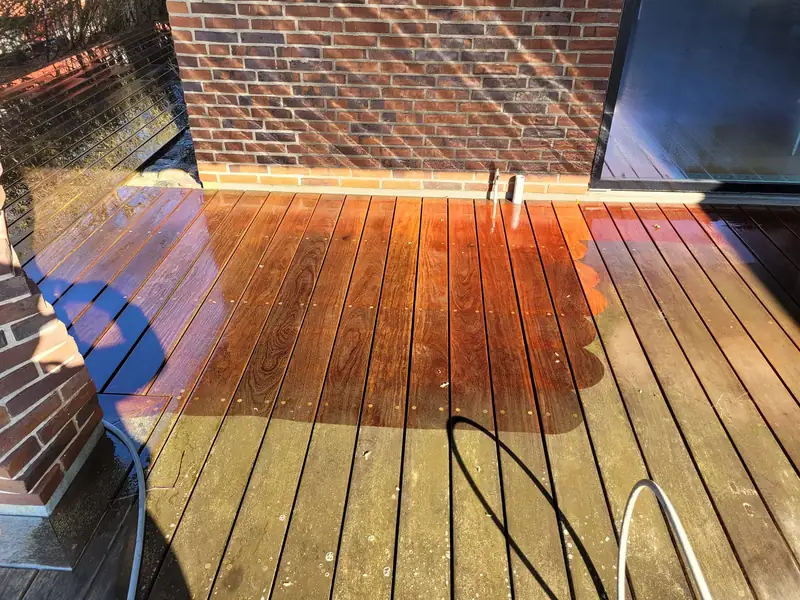Ved ankomst vurderede vi træets type og beskaffenhed, og valgte derfor at arbejde med maksimalt 130 bar tryk for at beskytte træet. Vi anvendte hedvand som den mest effektive rengøringsmetode og kombinerede det med en overfladerenser med specialdyser, designet til træ, for et grundigt og skånsomt resultat.