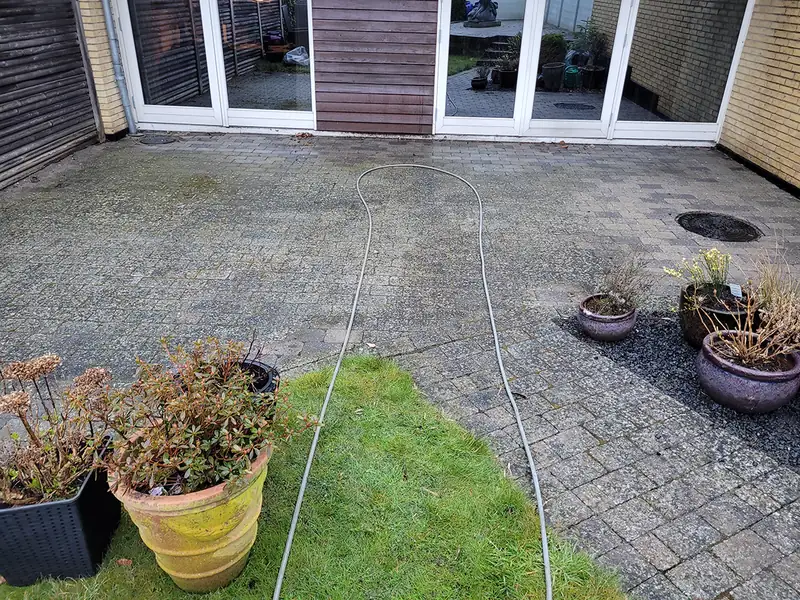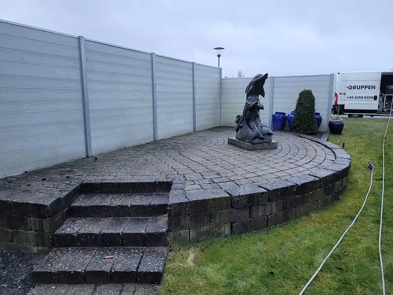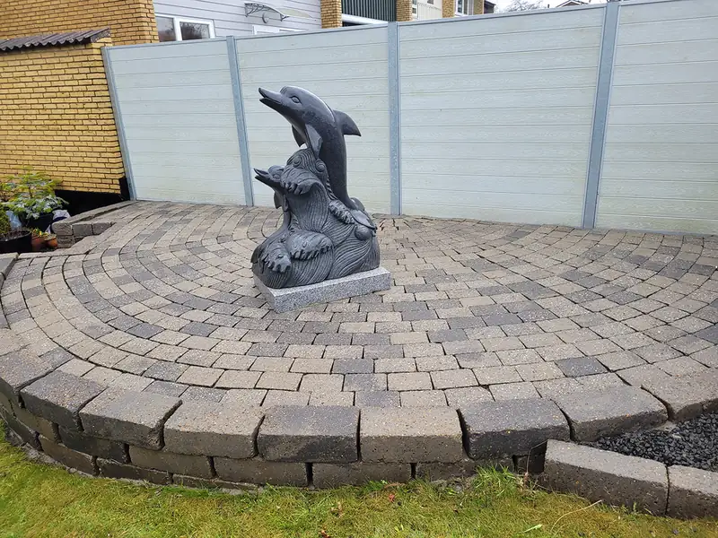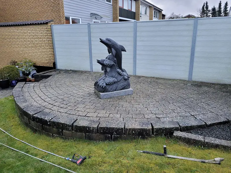 Hos en privat kunde i Fredericia har vi renset 100 m² Holmegaardsten på terrasse, gangbaner og omkring en smuk delfin-skulptur. På trods af udfordringer med vandforsyningen blev fliserne grundigt renset med højtryk ved 300 bar, hvilket fjernede den værste flisepest, som havde sat sig over flere år.