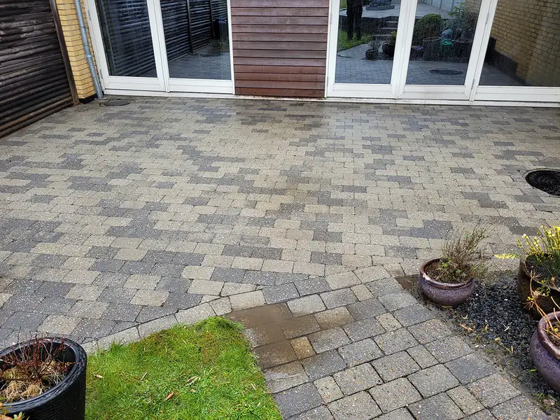 Efter rensningen har vi udført algebehandling for at forhindre mos og algevækst, samt imprægnering, der beskytter fliserne mod fugt og snavs. Til sidst blev der lagt fugesand, så fliserne står stabilt og flot.