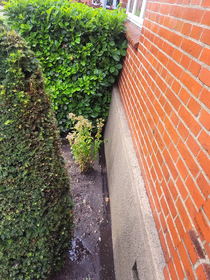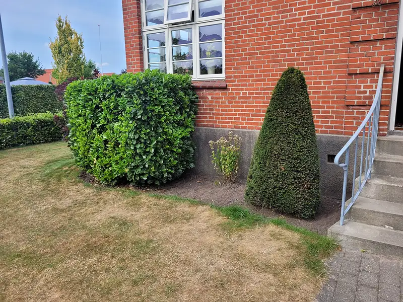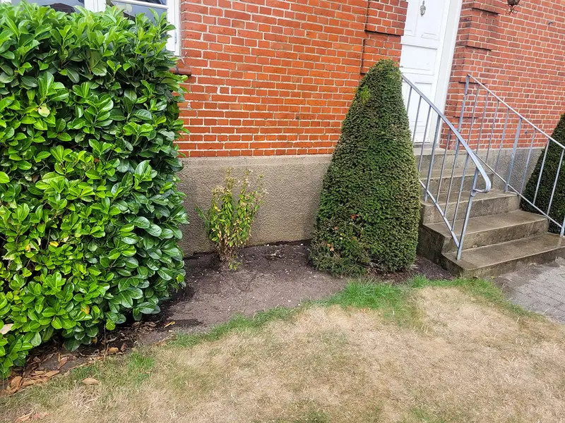 Facaderens i Vejen - facaderens af mindre areal for privat kunde i Vejen. Kunden havde haft besøg af en bil i haven som har ramt huset i løbet af vinteren og var dermed et forsikringsanliggende. Vores opgave var at rense muren som var blevet beskadiget i forbindelse med påkørslen og klargøre det ramte område til udbedring af skader af murerfirma. Vi skal muligvis forbi igen hvis forsikringen kræver busken fjernet og rense det resterende areal.