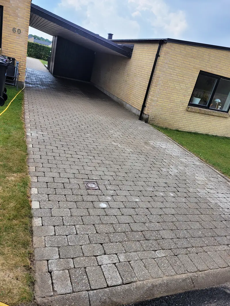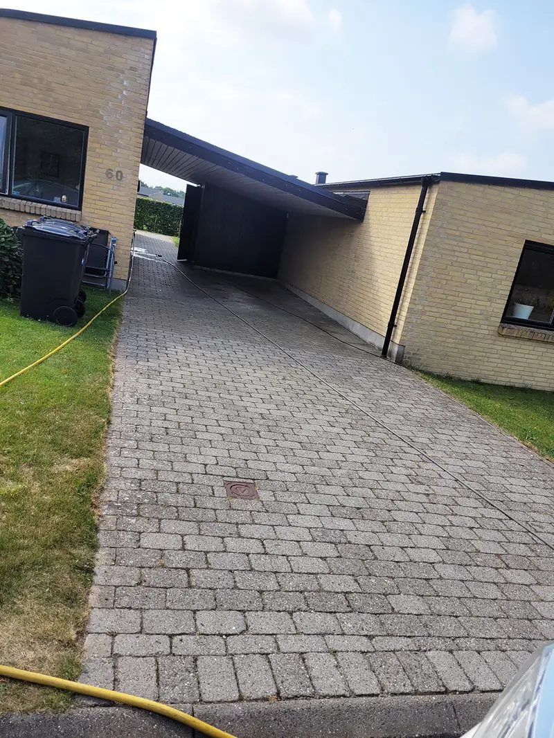 Fliserens i Kjellerup - hos privat kunde i Kjellerup, Herning har vi renset et mindre areal Holmegaardssten bestående af terrasse, indkørsel og gangbaner. Fliserne er samtidigt behandlet med imprægnering og algemiddel – og der er efterfølgende lagt nyt fugesand. Hedvadvansanlæg og et tryk på 300 bar på maskinen resulterede i et fint resultat som kunden var meget tilfreds med.